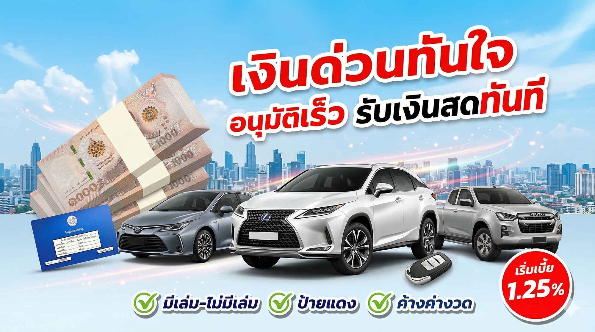 หากคุณต้องการเงินสดหมุนเวียนด่วน เราอนุมัติไว ให้วงเงินสูง ดอกเบี้ยถูกเพียง 1.25% ต่อเดือน รับทั้งรถใหม่ รถเก่า หรือรถติดไฟแนนซ์ก็ทำได้ ช่วยเสริมสภาพคล่องให้คุณทันที